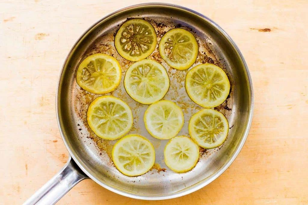 - Bedecken Sie den Boden mit Zitrone. Schneiden Sie ein oder zwei Zitronen in Scheiben und legen Sie diese auf den Boden des Topfes. Geben Sie so viel Wasser hinzu, dass die Scheiben und der gesamte angebratene Bereich bedeckt sind.