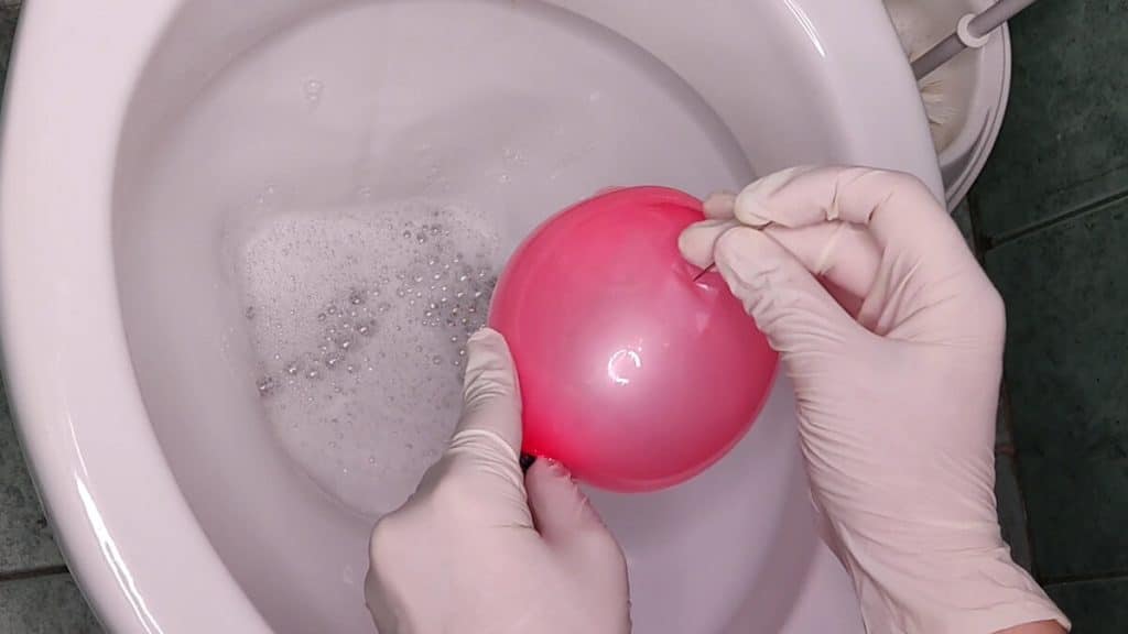 Genau hier hilft ein Luftballon. Er wirkt wie ein provisorischer Stopfen, der verhindert, dass die Lösung abfließt, und dafür sorgt, dass sie länger mit den Verschmutzungen in Kontakt bleibt.